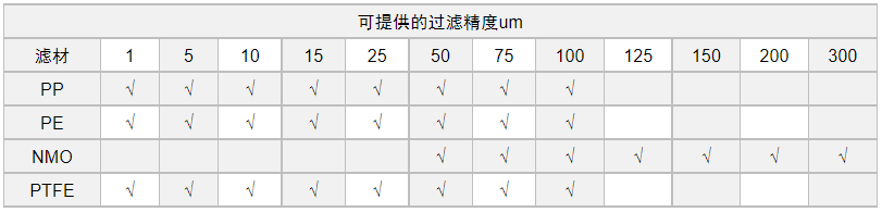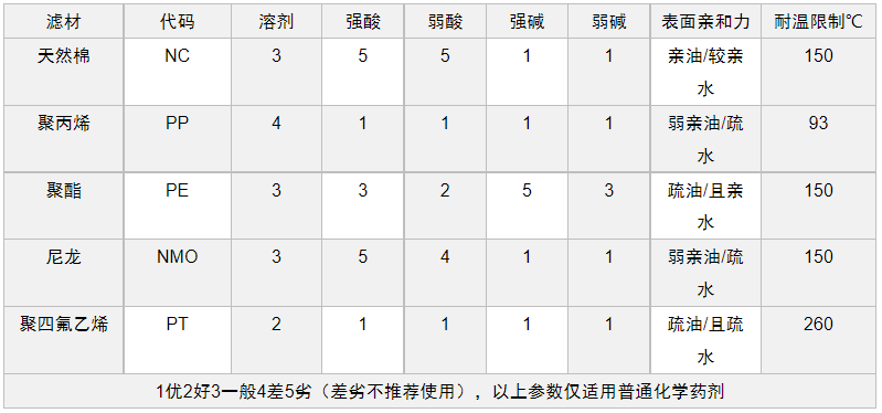 注:不同的濾材有不同的物理、化學特性,請參考下表,選擇適合的濾材。