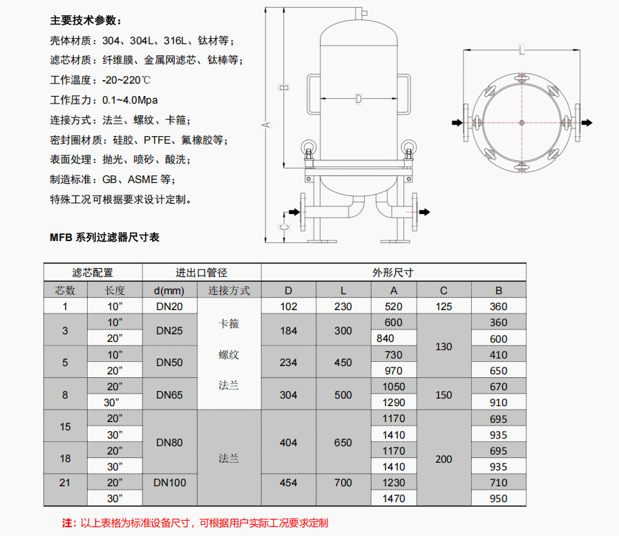 產品描述: JN-MFB 系列過濾器殼體內部濾芯托盤可設計為活動式結構后, 便于清理內壁死角區。過濾器殼體全部采用優質 304 316L 銹鋼材料制造,每臺過濾器都是經過嚴格的選材及精心制造而 成,保證完全無裂縫的流線型設計,具有良好的表面和最大的耐 腐蝕能力,以達到防止細菌污染的質量標準,衛生級過濾器套筒 獨特的結構,使每一個套筒的內外表面均沒有死角、可完全拆洗, 操作方便。 MFB 系列精密過濾器廣泛用于食品、制藥、化工、電子等領域 的流體后過濾工藝,如水、氨、油品、甲醇、燒堿及各種化工溶 劑精過濾等。