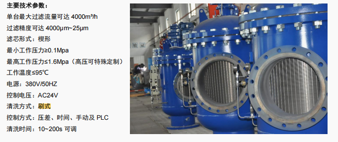 不間斷供水:清洗時水量極少,小于出水量的 1%,沖洗時間 為 215 秒,整個系統不間斷流; 過濾精度高:過濾精度最高可達到 25 微米,有各種精度的濾網 供您選擇; 過濾面積大:標準濾網有效過濾面積是入口面積的 740 倍; 清洗可靠:有多種控制方式,手動、壓差、時間、PLC 程序邏 輯控制等選擇; 安裝經濟簡單:結構形式多樣,適合于現場各種情況安裝,而 不影響運行效果。